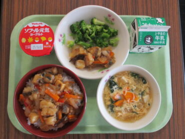 今日は「高岡食19丼献立」の日。高岡野菜の五目あんかけ丼でした。人参や玉ねぎ、しいたけ、赤ピーマンなどの野菜や白身魚に甘酢あんがからんで、最高のどんぶりです。何杯でも行けそうです。ふわふわ卵とほうれん草などの野菜がたくさん入った「かきたま汁」もおいしかったです。そして、なんといっても栄養満点です。
