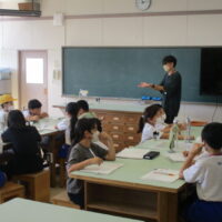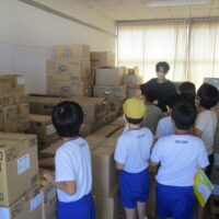 自然災害から人々を守る活動について学習しています。今日は、学校にある備蓄庫の中を見学しました。その後、備蓄庫にあるものや成美小学校が避難所になった時のことについて、用務員の山本さんにインタビューしました。