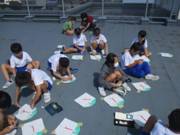理科では、「太陽とかげ」の学習をしています。今日は、影の向きの変化から太陽の位置の変化を調べました。およそ1時間ごとに記録をしました。また、遮光プレートを使って、太陽の位置を確認しました。今日の結果を基にみんなで太陽の位置の変化について考えます。