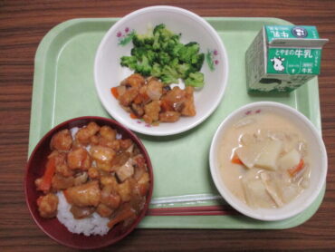 献立は、国吉きのこのチキン南蛮丼、ゆでブロッコリー、豆乳汁です。今日の食育丼は、肉厚の国吉しいたけなどの野菜、揚げた鶏肉においしい甘酢あんが絡んで、ご飯によく合い、おいしかったです。しかも、栄養満点です。もりもり食べて、インフルエンザを吹き飛ばしましょう。
