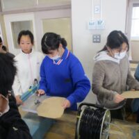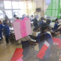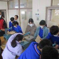 図画工作科では、マグネットボードを作製しています。電動糸のこぎりを使って、曲線を上手にカットしています。
