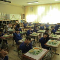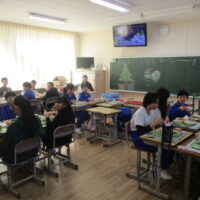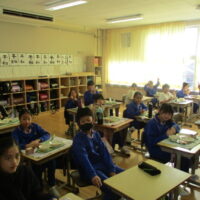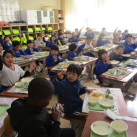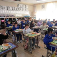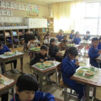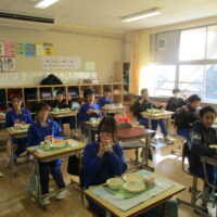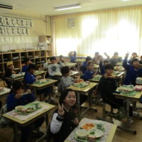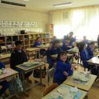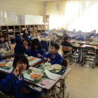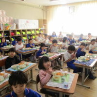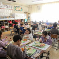 今日の給食は、みんなが楽しみにしている「クリスマス献立」でした。今日のメニューは、クリスマスライス、照り焼きチキン、サラダ、卵コーンスープ、チョコケーキです。少し早めのクリスマス気分を楽しみながら、おいしそうに食べていました。