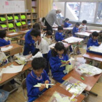ステンシルローラー版画に取り組んでいます。いよいよ、シールの切り取りです。集中して一生懸命に切っていました。はさみの使い方も上手になりました。