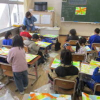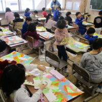 1組は「100より大きい数」の学習をしていました。先生の問いかけに反応よく答えたりつぶやいたりする子供たち。2組はステンシルローラー版画です。作業に集中する子供たち。もうすぐ、2年生・今日の半日体験入学にくる来年度の1年生の先輩になります。さすがです!