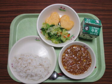 今日の献立は、「SDGs目標2 飢餓をゼロに 未来の食事献立」です。麦ごはん、大豆ミート入りキーマカレー、ハート型オムレツ、キャベツサラダ、牛乳です。