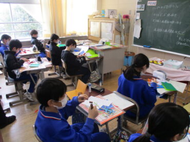 「とびだすハッピーカード」づくりをしています。平面ではなく、切り込みを入れて動きのあるカードになるよう考えながら作っています。