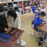 そろばんを使った計算の仕方を学習しました。初めて扱う児童も多く、教え合いながら学んでいました。