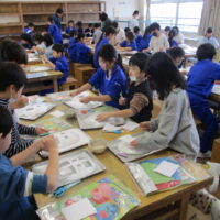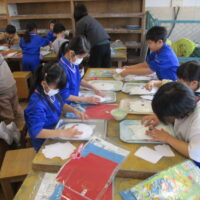 図画工作科「かぶってへんしん」に取り組んでいます。楽しいお面をつくろうと真剣です。このあとおはな紙をはり、色付けをしていきます。何に変身できるか、楽しみです。