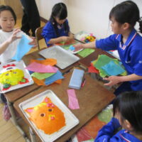 「かぶってへんしん」のお面の仕上げに入っています。カラフルで、楽しいお面ができてきました。